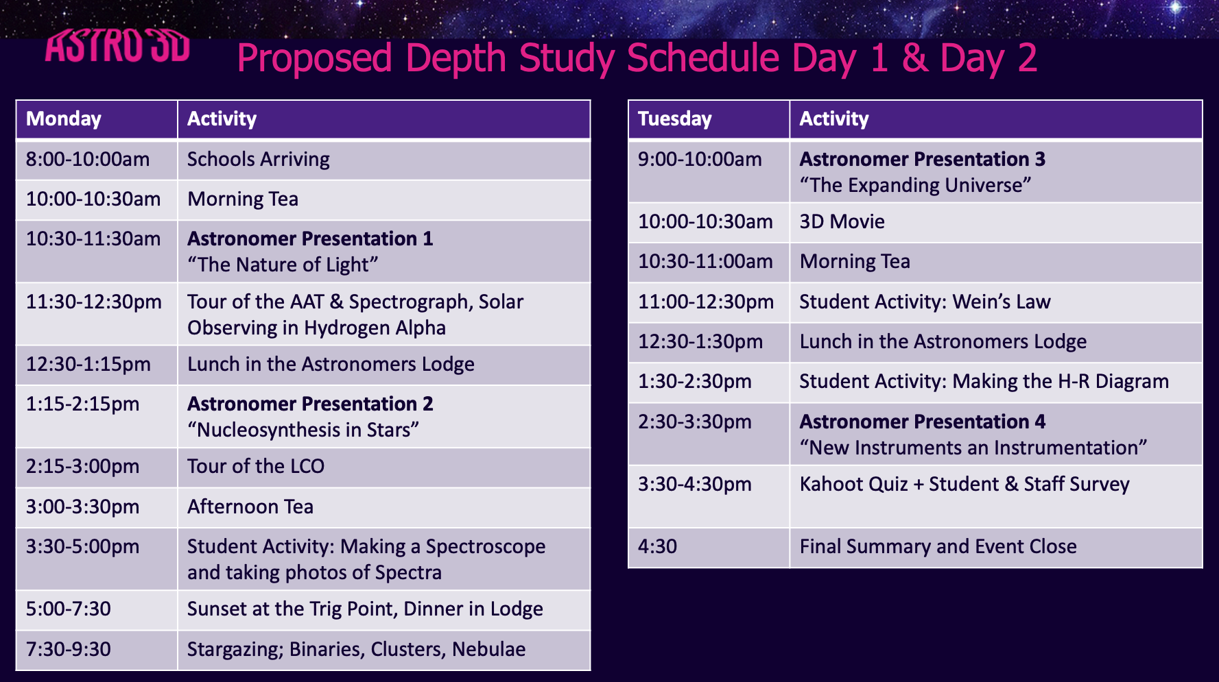 The program includes presentations from ASTRO 3D researchers, inquiry-based activities to develop understanding, tours of the SSO telescopes, solar observation, and evening stargazing. It is intended that the program continues to be offered annually at SSO.