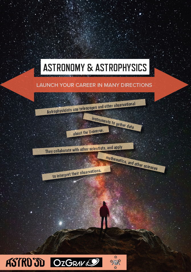 ASTRO 3D collaborated with the Australian Society of Astronomy (ASA) and the Centre of Excellence for Gravitational Wave Discovery (OzGrav) to develop an informative careers flyer for secondary school students interested in astronomy as a career and where it can lead into other industry roles.